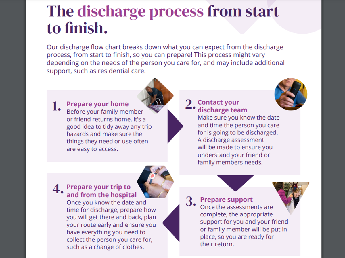 Understanding the discharge process and knowing what to expect can really help to alleviate worry and empower carers to advocate on behalf of someone who couldn’t manage without their support, making all the difference to the patient returning home and the people who care for them.”