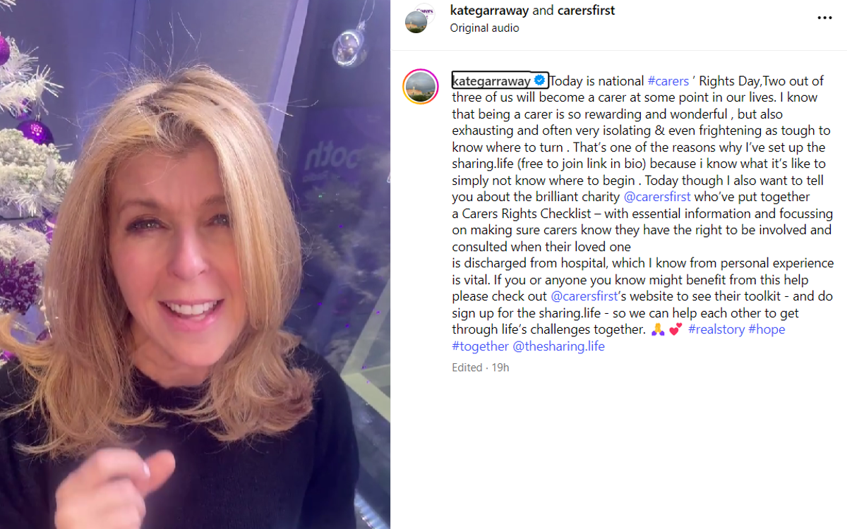 Her post read: "Today is national #Carers Rights Day. Two out of three of us will become a carer at some point in our lives. I know that being a carer is so rewarding and wonderful , but also exhausting and often very isolating & even frightening as it's tough to know where to turn. That’s one of the reasons why I’ve set up the sharing.life, because i know what it’s like to simply not know where to begin.